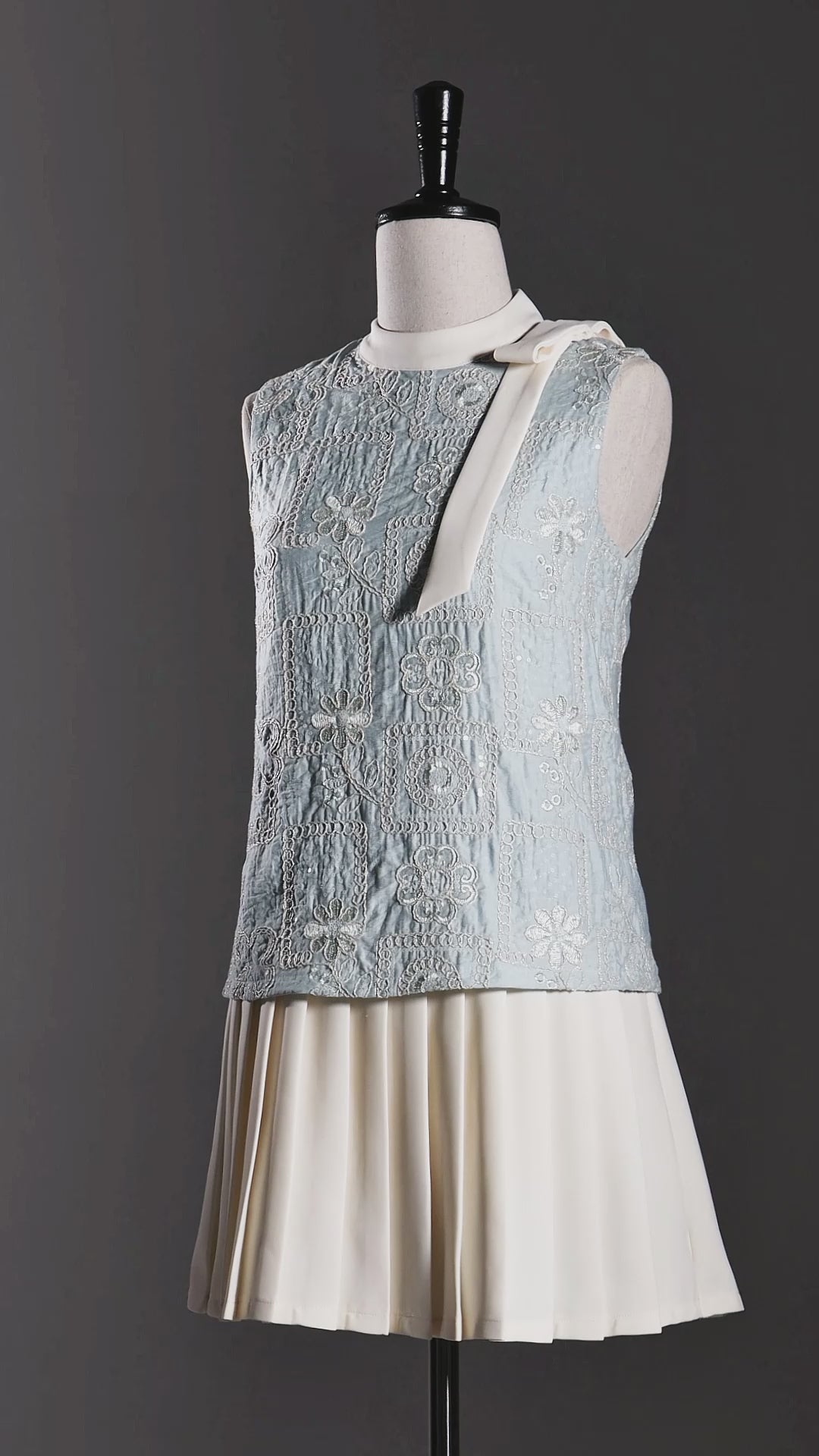 Vestido corto con delicados bordados, cuello redondo, lazo y falda en color blanco.