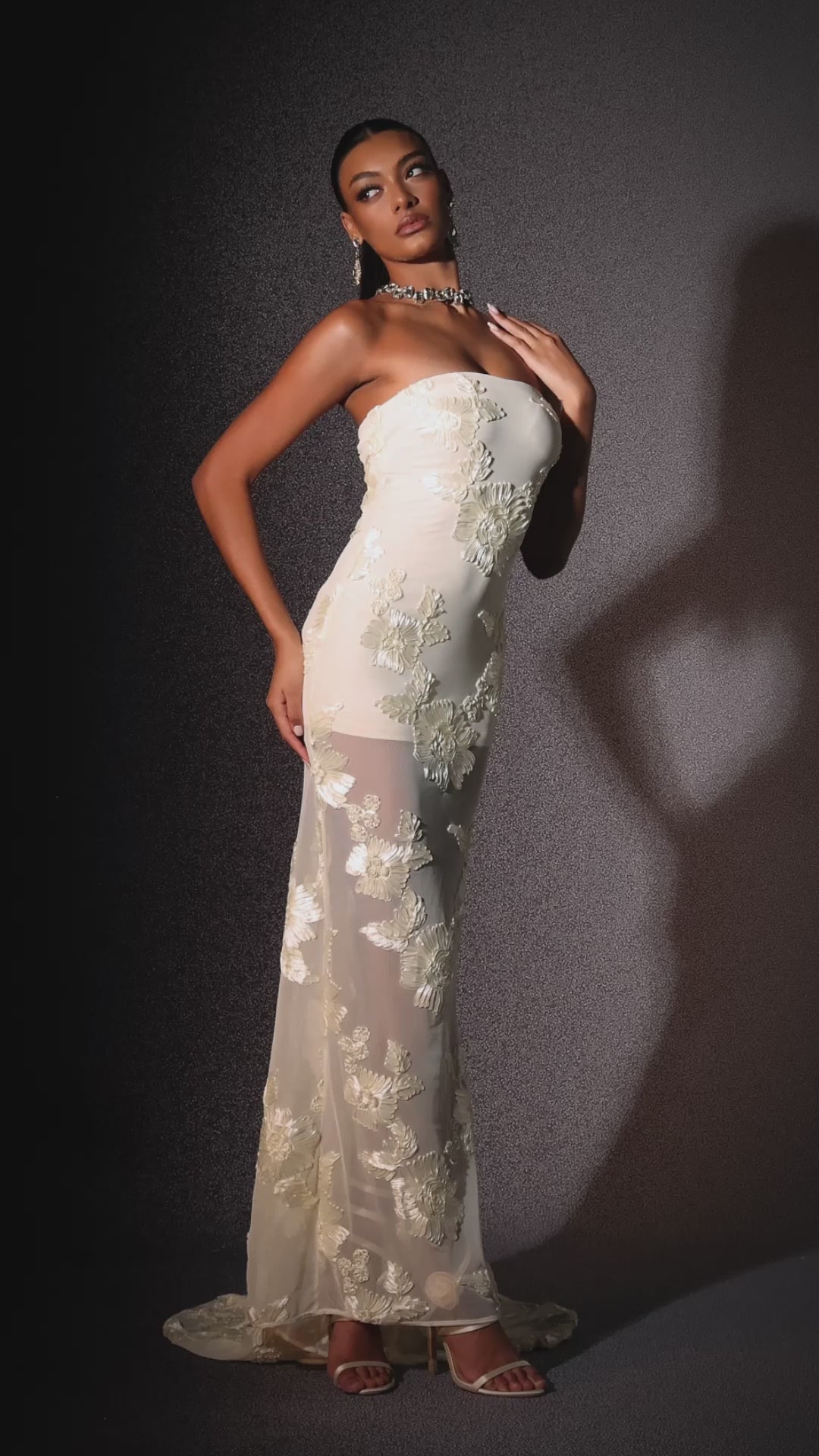 ¡Nuestro vestido largo sin tirantes, con bordado floral, hará que tu lado romántico brille con luz propia! Este vestido de ensueño presenta delicados apliques florales sobre una tela de traslucida y ligera. Su silueta fluida crea un look elegante, perfecto para ocasiones especiales.